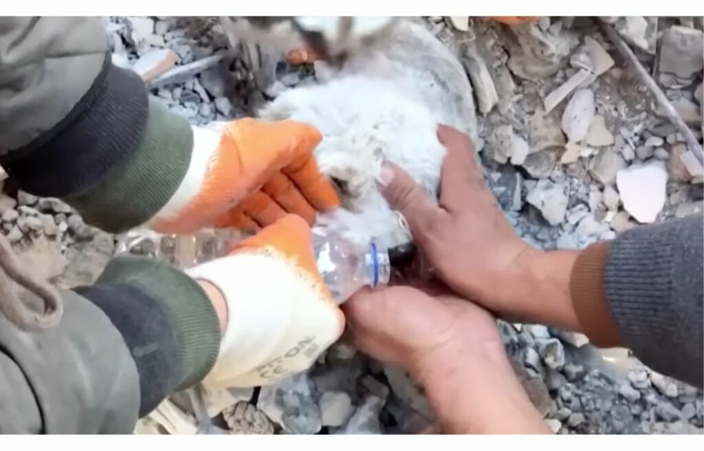 During the chaos, a rescuer gave water to Pamuk straight from his hand, a small but kind gesture.
