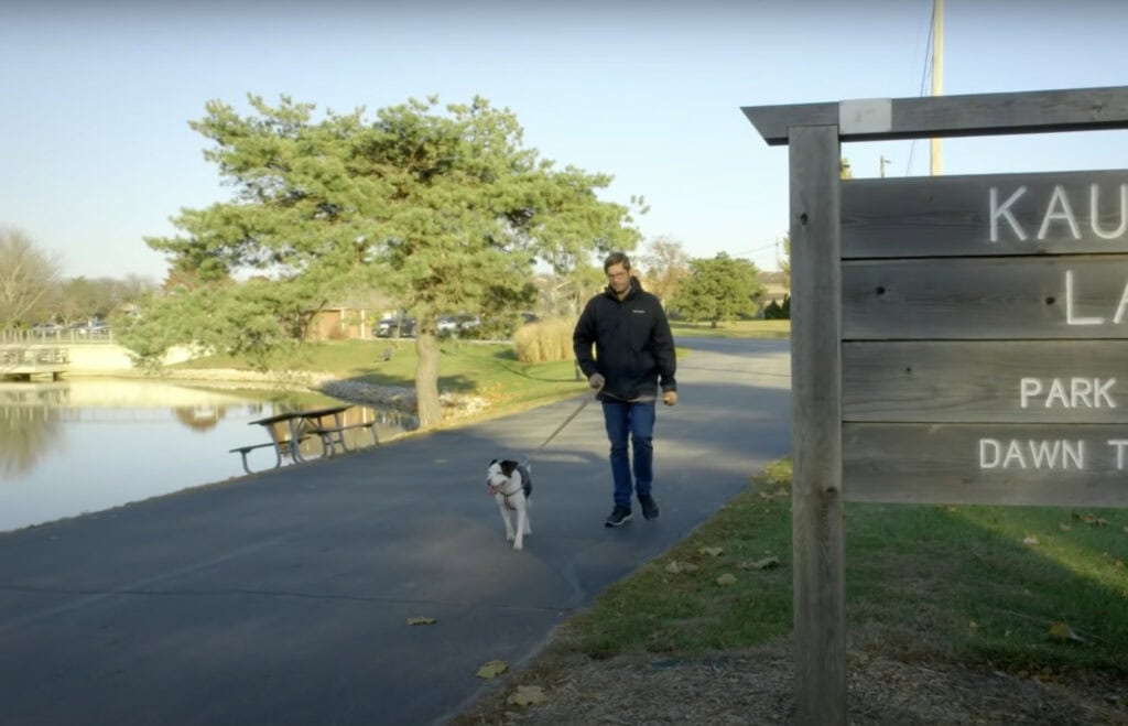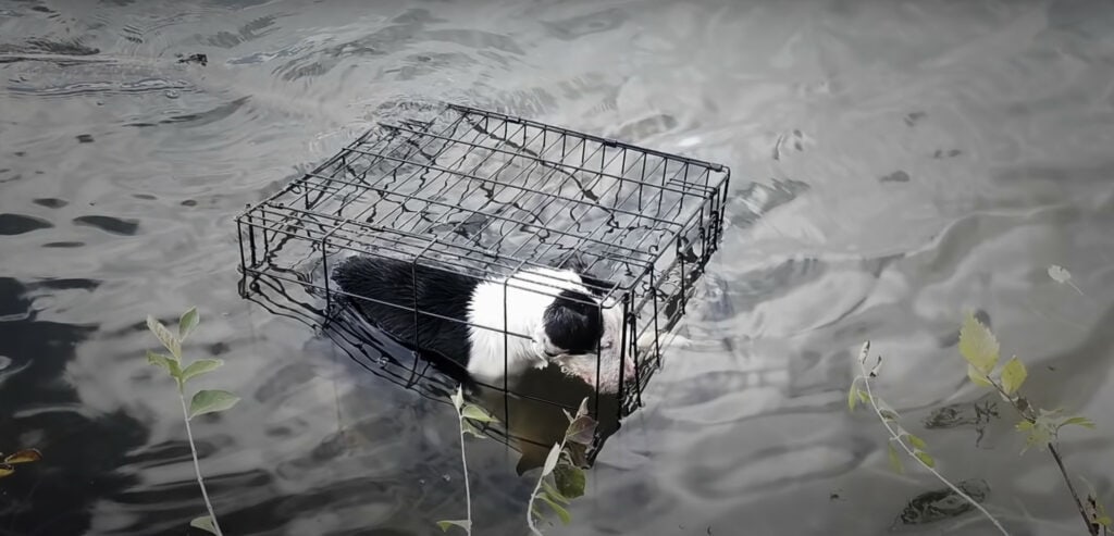Illinois fisherman Bryant Fritz spotted a cage with a small dog trapped inside, floating in Kaufman Lake.