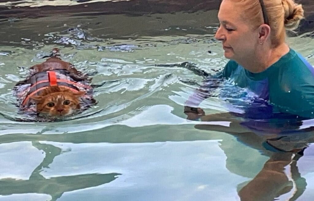 Known as “Thicken Nugget,” this friendly orange tabby is taking to the water to slim down and improve his health.
