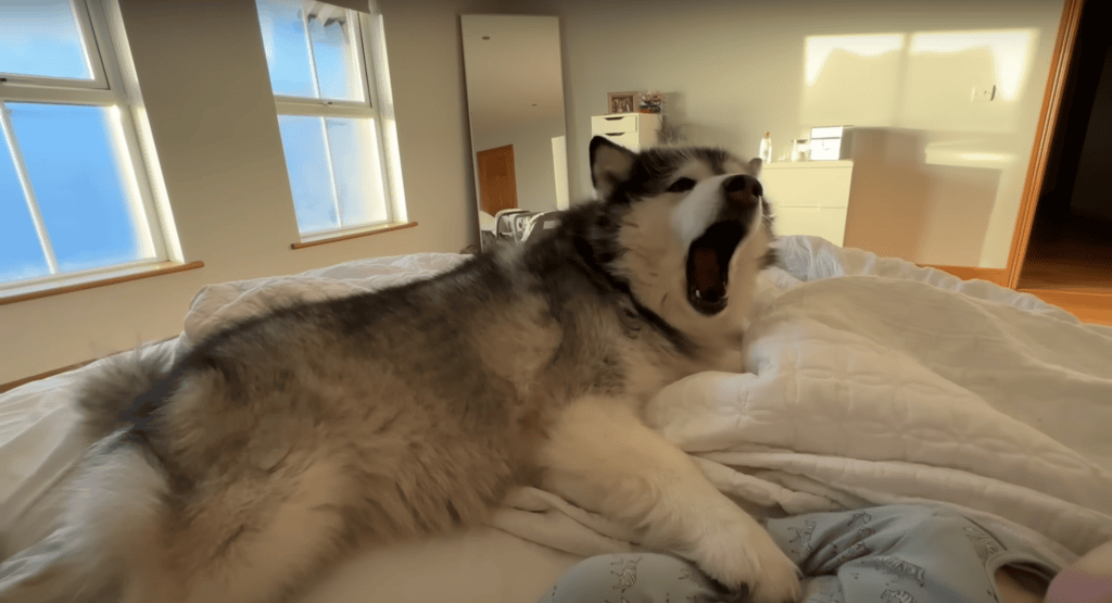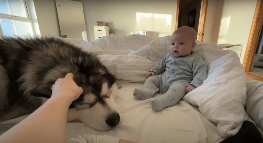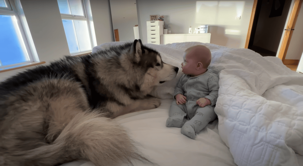 The video shows an Alaskan Malamute named Teddy and his baby brother, Nathan, at home in the morning.