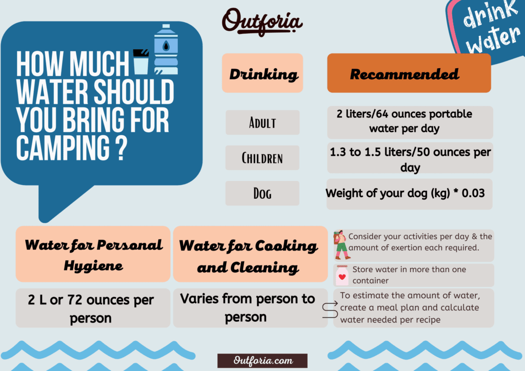 Many campers recommend about 72 ounces or about 2 liters of water each day per person for all of this.