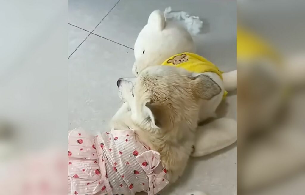 The puppy’s insistence on keeping its teddy bear close showcases its capability for deep emotional bonds.