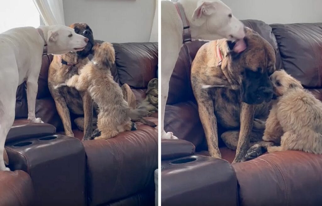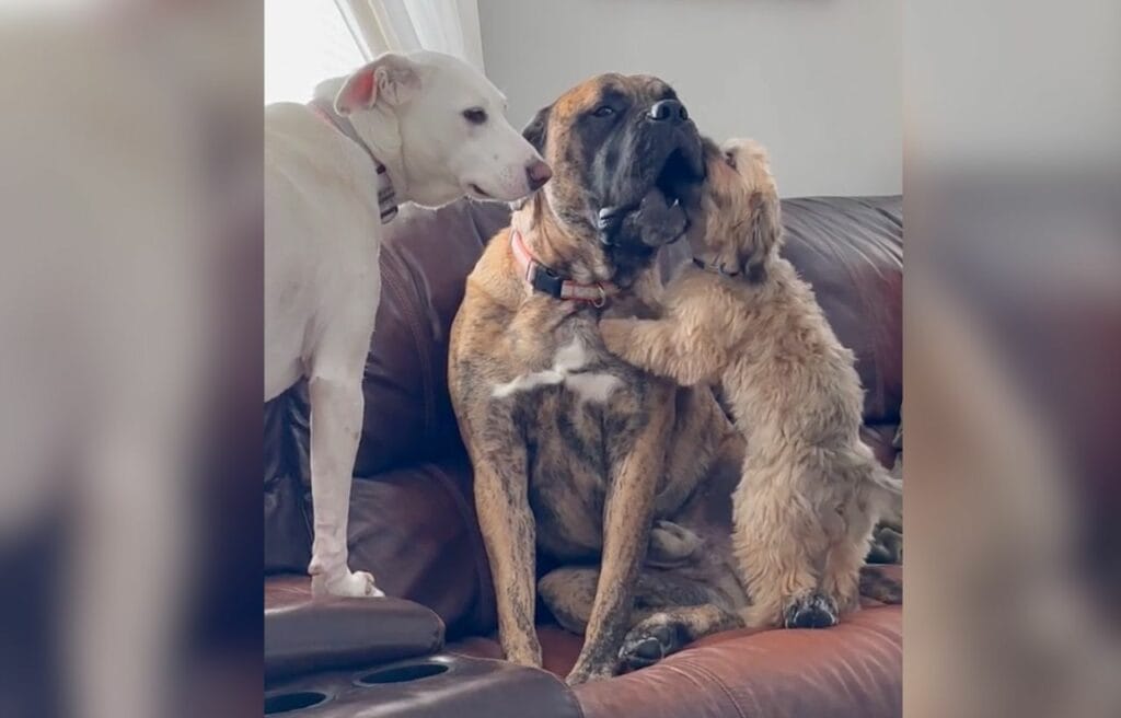 It shows Rex, a big mix of English and French Mastiff, getting comfort from his smaller dog friends, Huxley the Shih Tzu, and Winnie, who is white and deaf.