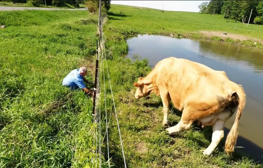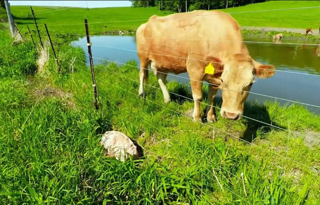 So he carefully helped the calf over the fence. Even though they both got a small shock from the fence, it was important to get the baby back to its mom.