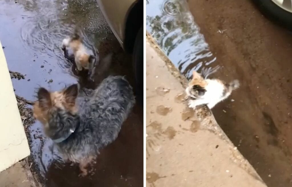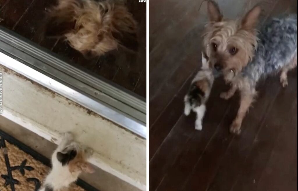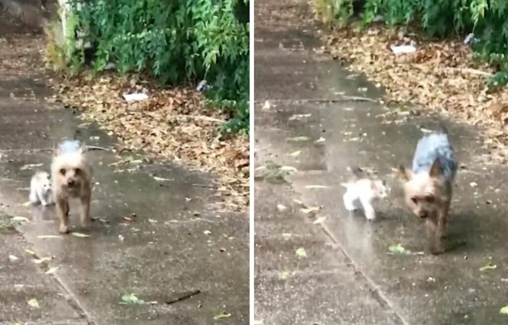 A little kitten left alone found a hero in a small dog—a mixed breed of a Yorkshire terrier, a Chihuahua, and a poodle named Hazel.