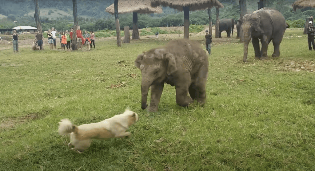 A lively puppy has made friends with a baby elephant, and it’s turned the park into their own fun space.